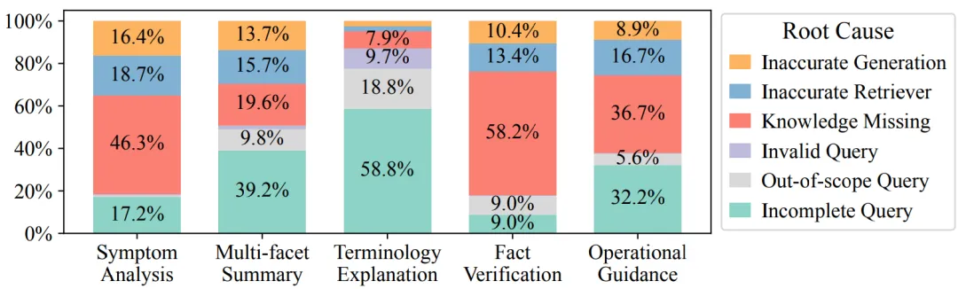 从上图可以看出,术语解释出错最大原因是用户提问太简略;故障分析出错最大原因是文档缺失。不过华为本文只通过加强query rewrite的手段,解决了前者,并没有解决后者(只是让LLM做个判断,RAG chunk是否和问题无关)。